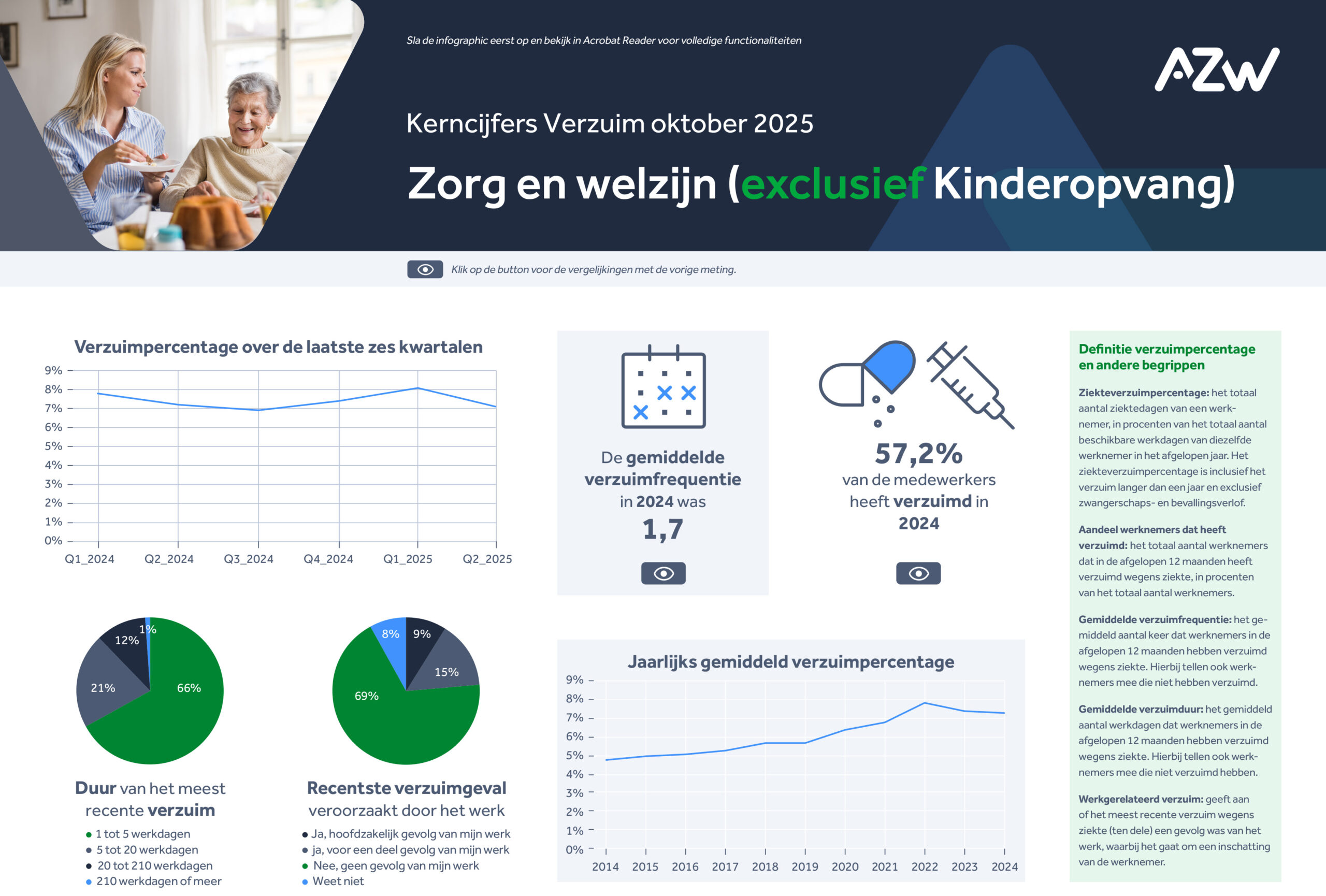 Ieder jaar publiceert AZW voor elke branche in zorg en welzijn een infographic met de belangrijkste verzuimcijfers. Dit jaar zijn daar ook cijfers over arbeidsomstandigheden aan toegevoegd met thema’s als betrokkenheid, werkdruk en tevredenheid. In één oogopslag zie je hoe het verzuimpercentage zich over de afgelopen zes kwartalen heeft ontwikkeld en welke verbanden er zijn tussen werkdruk, regelruimte en langdurig verzuim.