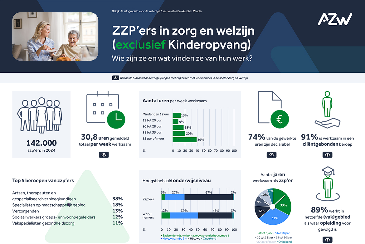 Hoe ervaren zelfstandigen zonder personeel (zzp’ers) het werken in zorg en welzijn? In 2023 zijn zzp’ers voor het eerst bevraagd over het werken in de sector. In 2025 voerde het CBS deze enquête voor de tweede keer uit. De resultaten van de meting in mei en juni zijn inmiddels gepubliceerd. AZW maakte voor elke branche binnen de sector, en voor de sector zorg en welzijn als geheel een infographic met de belangrijkste cijfers. Ontdek hoe zzp’ers het werken in de sector zorg en welzijn (zonder kinderopvang) ervaren en download hieronder de infographic.